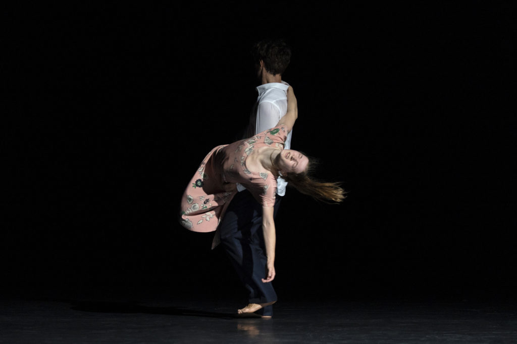 Il y avait eu le défilé, ouverture en liesse et en parade par les habitant·es, dans les rues de la presqu’Ile de Lyon. Puis Borda, évocation multiple, errances et frontières et liens, par Lia Rodrigues, en opening de Biennale. Là, retour aux ors de l’Opéra, pour ces Nuits Transfigurées, dansées par le ballet de l’Opéra de Lyon. Soit une soirée composée. L’ATDK des débuts, en ouverture de programme. Sa Nuit Transfigurée suit la partition et la dramaturgie de Schönberg, d’un couple où la femme apprend à son homme qu’elle est enceinte d’un autre. Une pièce de «jeunesse» (2014 par ROSAS) de De Keersmaeker, une danse presque classique et fluide quand on connait sa patte énergique et sèche. Les corps se répondent, la tristesse affleure, les gestes sont déchirements et la grammaire est celle de l’ATDK qui viendra. Le tout dans un décor dépouillé, seuls les corps, habillés de robe et ensemble pantalon, racontent.
