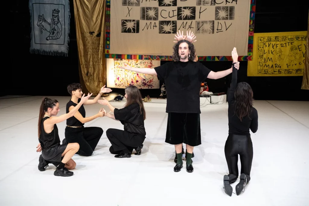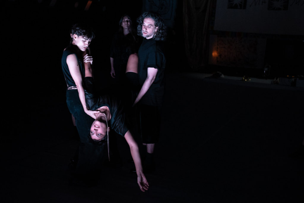 En tenues noires rehaussées de fins bijoux, huit interprètes – de danse comme de musique – habitent le plateau dans une célébration qui, à nouveau, plonge dans l’histoire pour la reconnecter au présent. Le chant s’insinue dans la danse, créant une infusion polyphonique aux langueurs captivantes, aux précipitations enivrantes. Kassia Undead tient de la sarabande carnavalesque comme du rituel funéraire, oscille entre Orient et Occident, navigue de mélopées médiévales en envolées électro, déploie une énergie tantôt sensuelle tantôt mystique, sur fond de créations textiles hybrides réalisées par les Ateliers Indigo. Et lorsque Cate Hortl est peu à peu drapée par ses acolytes de lourdes étoffes, d’ornements chatoyants, elle se mue en prêtresse d’un culte inédit, en icône guerrière parée d’une douceur et d’une puissance inouïes.